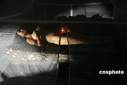 2007年9月23日,在北京左右艺术区“99个帐篷,99个梦想”的创作现场,海容天天展示了裸体行为艺术《莲》。通过由垃圾和混凝土筑成的台子、裸体的美女、焚香、莲花、帐篷等元素以及与观众的互动,行为艺术家表达了在钢筋水泥的“森林”里对自然和人性的呼唤。中新社发 鲁谷 摄