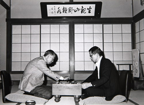 20世纪70年代初期的照片:福田康夫(右)和父亲福田赳夫在日本箱根下围棋