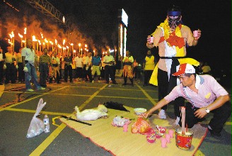 台海网9月25日讯一场驱鬼的路祭让彰化县花坛乡与紧邻的秀水乡陷入剑拔弩张气氛中。秀水乡民担心好兄弟被对方逼赶窜逃到乡境内,设路障严禁对方越界,还布置炮阵、插青竹符对阵,结果办路祭的仑雅村民改变路线,仪式23日晚顺利结束,“阴阳相安”。