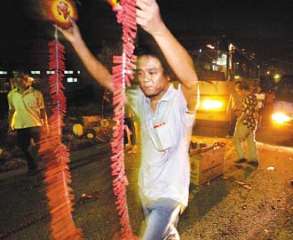 秀水乡民对抗花坛乡民的驱鬼仪式,以汽车、鞭炮挡在乡界交界处,阻止对方把“好兄弟”赶进秀水乡 。 (图片来源:《联合报》)