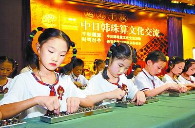 中日韩小学生竞演珠心算 大河网-河南日报 2007.09.2605:39 关注 9月24日,第九届亚洲艺术节“运筹千秋”中日韩珠算文化交流活动在江苏南通珠算博物馆举行,各代表团中的学生代表进行了珠算、珠心算表演。新华社发 来源: