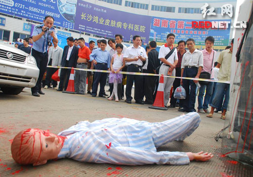 (虽然“死者”是假人所扮,但现场演示的出来的交通事故后果让围观的人感觉震撼)