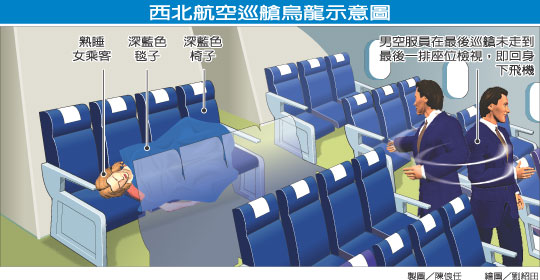 这对台湾情侣原本坐在一起,但女乘客在飞行途中自行跑到机尾最后一排空位睡觉,熟睡过头,且因西北的座椅是深蓝色的,女乘客盖的毛毯也是深蓝色,空少巡舱未查觉有人,负责最后清舱的座舱长也没发现,才造成“机内净空,乘客还留在机上”的离谱状况。更离谱的是,女乘客的男友是在下机后,一直到通关才查觉女友失踪了,紧急通知地勤回飞机里找人。