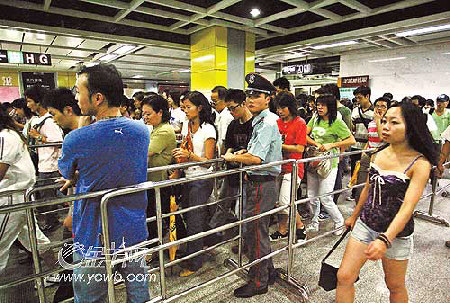 本报讯记者李春暐、黎存根报道:“我听见有人猛叫‘唔该借借,我要落车’,便下车让了一下,哪知再也上不去了。”昨天下午5时许,广州地铁三号线体育西站的罗先生很郁闷,地铁站内,中秋归家的人群几乎把三号线逼瘫。