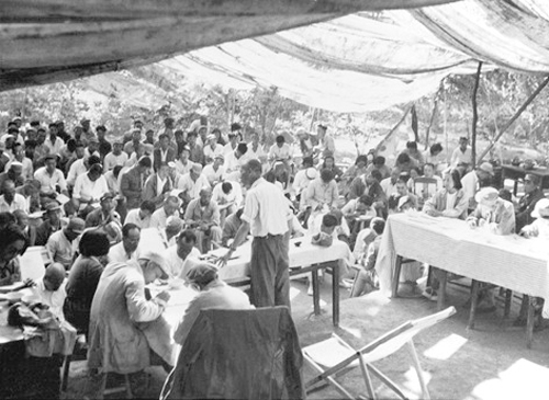 全国土地会议及时总结了土地改革工作的经验,进一步发展了党的土地政策。会议通过的《中国土地法大纲》是抗日战争胜利后,中国共产党公开颁布的第一个关于土地制度改革的纲领性文件。它向全中国和全世界表明:中国共产党高举反封建的战斗旗帜,为在全国消灭封建剥削的土地制度提供了一个基本纲领,极大地推动了新老解放区的土改运动。到11、12月间,各解放区掀起了轰轰烈烈的土改运动,彻底摧毁了几千年的封建土地制度,广大群众参军支前的积极性空前高涨。(上图:中共中央工作委员会在河北省平山县西柏坡村召开的全国土地会议会场。)