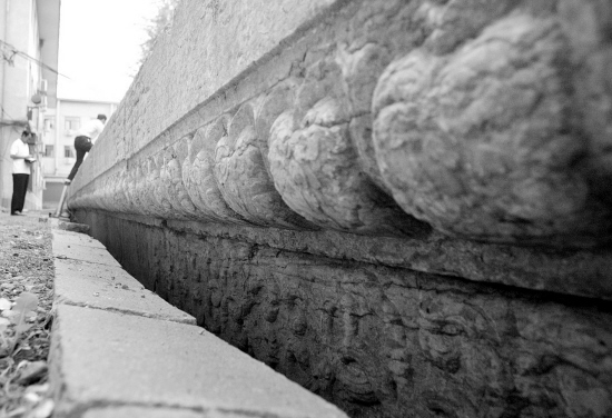 记者看到,这个建筑基础长29.1米、宽1.6米、残高1.1米,整个基础由花岗岩制造,为高浮雕上仰莲、下覆莲“须弥”基座,两侧各有1.45米长的“盘肠儿”图案,北侧两端各雕刻“宝珠”,基座之上,残留两层青砖。
