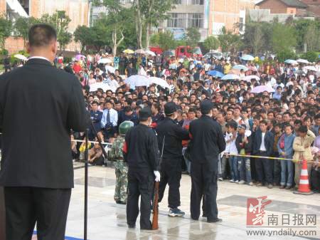 昨日清晨7时许,广南县铜鼓广场上已有数百人冒着细雨聚集在这里。这里是震惊全国的广南特大袭警案公开宣判的现场,案犯赵忠文在这里接受终审判决,并于当天在广南县城郊被执行死刑。
