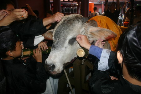 当祭孔仪式结束,在大成殿行礼如仪的人,不论老少,一拥而上抢拔黄牛头上的“智慧毛”,尤以耳朵、眼睛及眉心最抢手。孔庙人员说,这三个地方的毛,有“耳聪目明”之意。