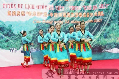 当日,记者随同部份嘉宾和游客从百南乡大桥头即老虎跳大峡谷跨国漂流起漂点开始顺水南下。一路上,河道蜿蜒,既有急流险滩,又有平镜湖面。在近两个小时的漂流过程中,河边两岸的青山绿水令人赏心悦目。越过中越589号国界碑后,就置身于异国了。在界碑下游一公里处的临时止漂点,越南演员为我们献上了一台丰盛的民俗歌舞表演。