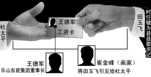 崔金峰的侄子崔玉清提议将时任乐山犍为县委书记的田玉飞引见给杜太平。随后,田玉飞从崔金峰手中得到杜太平的电话,并费尽心机、千里赴京将一张银行卡送到杜太平手中,借口就是“你的女儿不是要出国了吗?”当时,卡内的钱不足10万,但很快40万元打入了该卡。原来,这张银行卡是企业家王德军的一张工资卡。