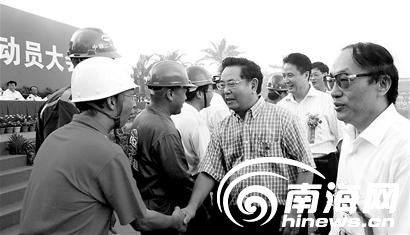 图为铁道部部长刘志军(右一)和海南省委书记卫留成、省长罗保铭与参加东环铁路建设的单位代表们一一握手。李英挺摄