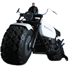 美国人乔治·杜汉是改装车迷,他亲自打造了一辆世界上最大的摩托车,高3.429米,长6.187米,重2.948吨,仅轮胎就有1.88米高,需要由一个8.2升的V8发动机提供动力。