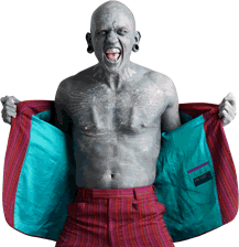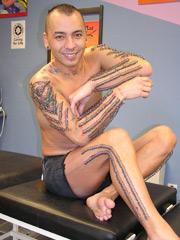 澳大利亚人戴蒙德· 林奇前后花费了1000小时在身上刺满了数百种文身,最初他从世界各地收集了各种彩色图案刺遍全身,后来他开始用百分百的黑墨来文身,而且连眼皮、耳朵里、齿龈甚至脚趾间的极其脆弱的皮肤也都不放过。现在他正在用白色纹身覆盖黑色图案,将来他还打算在上面再刺一层彩色图案,这样前后加起来,他的皮肤将会被针密密麻麻地刺上4层文身。
