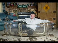 蛇是许多人最恐惧的动物,但偏偏有人喜欢挑战高难度。2006年11月,美国纽约的杰克?毕比在没有任何帮助的情况下咬着10条活响尾蛇的尾巴坚持了10秒钟。另外,他还曾在1999年与75条响尾蛇在澡盆里共同待了一阵,而另一名美国人雷诺兹同一时刻也在另一个澡盆里与75条响尾蛇嬉戏。