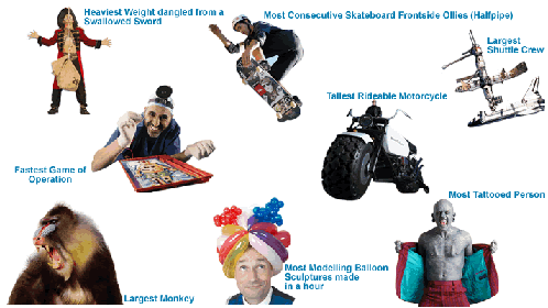 据吉尼斯世界纪录网站报道,世界纪录大致分为八个门类,即“人体”、“惊人技艺”、“自然界”、“科技”、“艺术和媒体”、“现代社会”、“旅游和交通”以及“运动和游戏”。