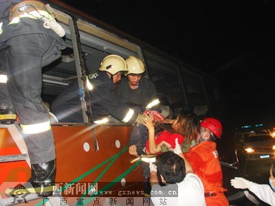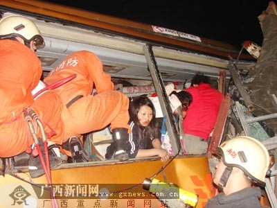 据南宁市消防部门的消息称,救援人员到达后,立即携带破拆工具深入狭小的车内进行破拆、切割。9时10分,历经5小时的紧张奋战,救援人员将车内受伤乘客全部救出。受伤人员已被送往广西医科大一附院、自治区人民医院、南宁市江滨医院等五所医院进行救治。