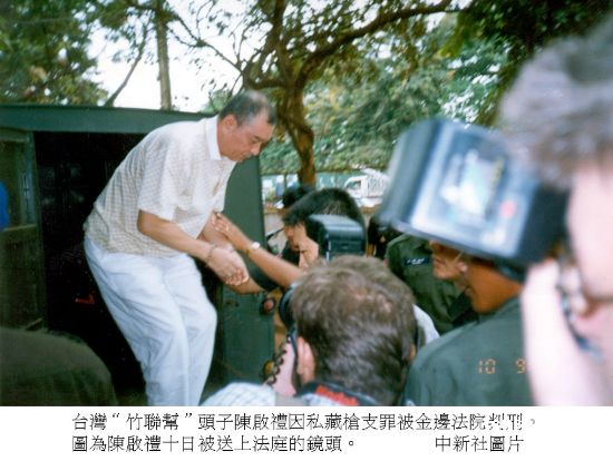 资料图:二00一年,台湾“竹联帮”头子陈启礼因私藏枪支罪被金边法院判刑。图为陈启礼被送上法庭的镜头。中新社发