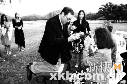婚礼最别致的场面,是按照犹太人的习俗,明可夫先踩碎一块玻璃;之后,在马友友演奏的“卧虎藏龙”音乐中,再按中国人的习俗,新郎新娘,分别在明可夫的母亲、孔令华的外公外婆以及父亲母亲前双膝跪下,一一奉茶、鞠躬。个子高大的明可夫,认真而虔诚,包括明可夫的亲友和好莱坞同伴,长辈们高高兴兴,一一给两人888元的大红包,这幕感人的画面,让包括明可夫亲人和好莱坞伙伴在内的许多宾客,感动得相拥流泪。