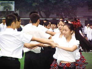 迈着轻快的舞步,男女学生翩翩起舞。昨日下午,重庆外国语学校举行我市首个校园集体舞比赛,除毕业年级外,其他年级全部参加,成为我市第一个普及校园集体舞的学校。