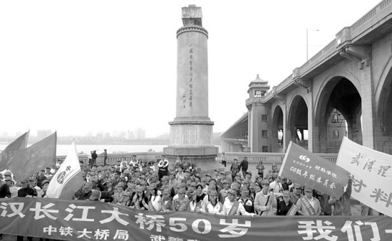 10月14日,来自武汉各界的人士在武汉长江大桥桥头,参加纪念大桥建成通车50周年活动。
