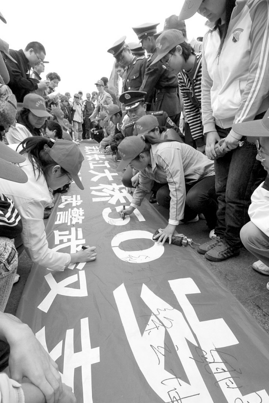 10月14日,来自武汉各界的人士在横幅上签名,纪念武汉长江大桥建成通车50周年。新华社记者程敏摄