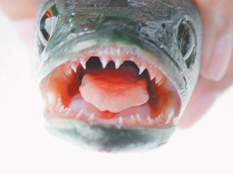 曾文水库受鱼虎为害,牙齿锐利充满功击性。照片/嘉义大学赖弘智