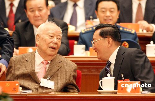 十月十五日,中国共产党第十七次全国代表大会在北京人民大会堂开幕,中共中央政治局常委罗干(右)与九十一岁高龄的原全国人大常委会委员长万里交谈。中新社发 毛建军 摄