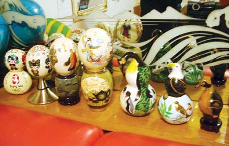 昨日,记者在薛思勤老人家看到了他精美的作品。有三个是在鸵鸟蛋上绘制的,还有四个是绘制在葫芦上的。三个鸵鸟蛋上分别绘制着“五福娃”、西游记人物、神话人物;四个葫芦上分别绘制着“五福娃”迎奥运、企鹅孵小企鹅、鹰和刚孵出来的鸭子。记者发现,其中鸵鸟蛋的作品,都被薛思勤用买来的精美底座托着。“五福娃”图案的鸵鸟蛋,甚至被制作成了感应台灯。