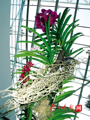 “洋兰”分布在“三叶”温室最左边的“叶子”里,记者发现了“一棵开花的树”——斜叶榕的外面附生了几株“万代兰”,开得煞是绚烂,有紫、红、白三种颜色,每株还拖着长长的根须,最长的达5米。一位参观的市民惊奇地问道:“这些兰花怎么是插在树干上的?根暴露在空气中还能活吗?”