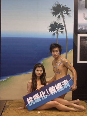 据“中央社”报道,记者会除了展示部分平面海报外,还请两名大学生上演裸体真人海报秀,以“抗暖化、救经济”为口号,扮演“海王子”拯救因海水温度上升面临生存危机的“美人鱼”。