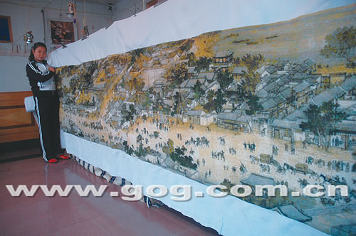 金黔在线讯 昨日,贵阳市半边街的龙顺珍女士向记者展示了她和10余人,历时一年半之久,一针一线绣成的30米长十字绣《清明上河图》。