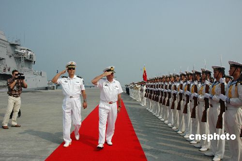 中方南海舰队副参谋长么志楼少将在码头举行仪式,欢迎新舰首次访问湛江。中新社发 李根成 摄