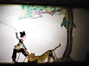 昨日,记者在现场看到,白纱挂起来、箭杆挑起皮影儿,锣、鼓、钹敲起来……白纱背后秦老师舞动十指,且唱且述。灯影下,武松英姿勃发,老虎上蹿下跳,随着情节的发展,武松一个箭步跨到老虎背上,铁拳砸下,老虎嘴一张一合,嗷嗷大叫……