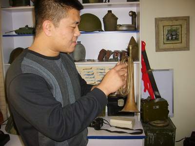 “小时候,很喜欢战争题材的电影、书籍,就喜欢军人们身上佩带的装备,总想长大后也能当一名军人。可是很遗憾,梦想没有实现。”袁志刚抚摸着一个他喜爱的大檐帽向记者谈起最初的梦想,“因为祖父和父亲都是军人,家里的一些子弹壳、小喇叭之类的东西便成为我最早的玩具。随着年龄的增长,便开始渐渐喜欢上收集这些东西。”从上世纪90年代开始,他通过逛古玩市场、上网等途径,开始了军用品最初的收藏,先是解放军的皮带、背包,然后是各个时期的各种便帽和大檐帽等,后来开始收藏一些抗战时中国军队的物品,如中国军队的帽徽,军官的带扣,文件包,马克沁重机枪弹箱等等。