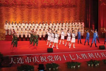 昨天晚上的市广电中心剧场是一片歌声的海洋。由市委宣传部、市文化局、市广播电视局、市文联主办,市群众艺术馆、市音乐家协会、大连电视台承办的“大连市庆祝党的十七大胜利召开群众合唱大会——《放歌十七大 再跨新征程》”群众合唱大会激情上演。市领导张成寅、夏德仁、李永金、林庆民、怀忠民、里景瑞、魏小鹏、肖盛峰、宋善云、汪集刚、李明、刘长德、郑全慈、董长海、唐建武和我市参加十七大的代表林安西、牛钢、王健林以及列席代表张德祥与千余名观众一起观看了这场演出。