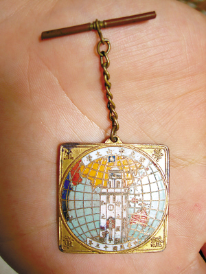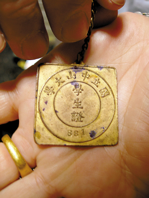 本报讯(记者曾毅摄影报道) 一枚正方形的金黄色金属块,正面以亚洲地图为背景,主体为一钟楼;背面则清晰印着“学生证”三字,编号为“881”。这是建国前中山大学的校徽,至今已有超过60年的历史,根据考证是中大建校以来第一代的校徽,存世极少。