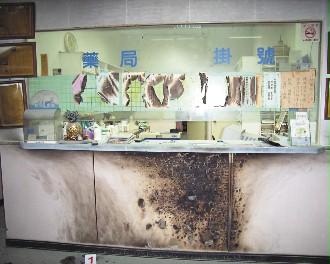 台中县男子施茗杰引火自焚,诊所柜台下方遭火烧焦一片。