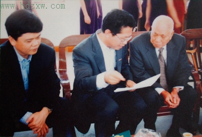 2002年,林梧桐(右一)最后一次回乡谒祖,向梧桐中学校长林绍清了解学校情况