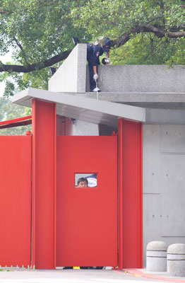 案发地点属于玉山官邸内卫区,图为鉴识人员在哨所顶搜证。