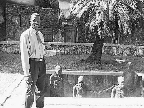 哈里先生向参观者介绍拍卖黑奴的奴隶坑。