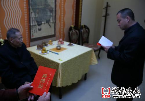 本报讯 手执大红拜师帖,向师父三拜九叩,拜入师门,学习武艺……昨日上午,一场如今只能在武侠电视剧中看到的传统拜师仪式,在火车站附近一家宾馆内正式举行,十位热爱武术的市民正式拜师,学习梁氏八卦掌,希望在强体健身的同时,也将八卦掌这一中华民族传统文化发扬光大。