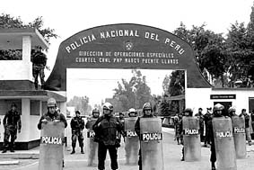 图为9月22日,在秘鲁首都利马,警察严密看守关押藤森的临时监狱所在的警察营地大门 新华社供图