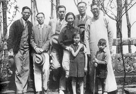 ▲一九三八年八月九日,西南联大聘请梁思成(左二)、林徽因(左四)为校舍建筑工程顾问。这是联大期间,他们携子女梁再冰(女)、梁从诫(男)与联大教授周培源(左一)、陈岱孙(左三)、金岳霖(左五)、吴有训(左六)等合影。(选自《周培源》)