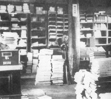 ①图书馆内用废汽油桶、木箱叠架起来的书架。(北大校史馆提供)