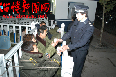 执勤的民警为夜里排队的群众送来姜汤。