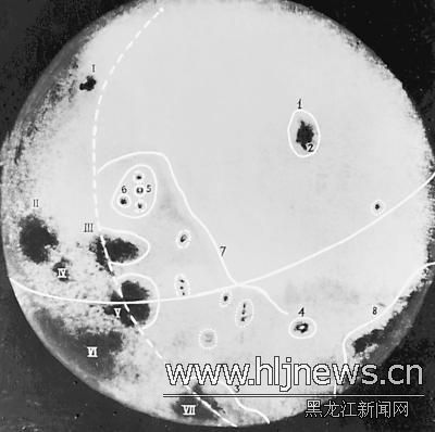 1959年10月4日,前苏联发射了月球3号探测器,它从月球背面的上空飞过,拍摄并向地球发回了约70%月背面积的图片。横过画面的实线是月球赤道;虚线是从地球上看得见和看不见的月球两个部分的界线。