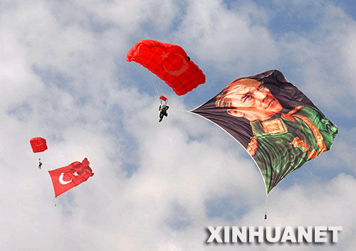10月29日,在土耳其首都安卡拉,土耳其空军伞兵在空中打开土耳其国父凯末尔的画像。新华社记者 郭磊 摄