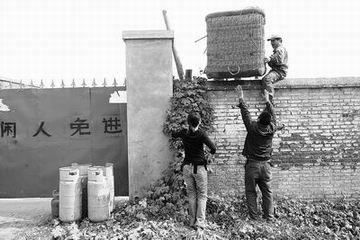 由于一直找不到大门钥匙,一名男子只好爬到墙上,骑在上面,接过里面同伴递上来打好的包裹,一件件往外扔。