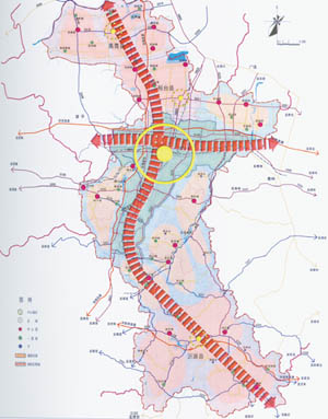 解读:一城,指一个中心城区;两轴指依托交通联系主轴线,形成联系中心城区和三个现成的南北向市域经济发展轴和东西向市域经济发展轴,发展轴承载着市域空间上的联系,构成市域经济发展的梯度关系;十三片,指由地理临近、职能相关、发展相联系的城镇组成的十三个城镇组群。建立中心城区、3个县城、18个中心镇和22个一般镇组成的四级城镇体系。规划至2020年,中心城区内撤并村庄110个,保留村庄123个,其中重点发展的村庄43个,整理用地48.55平方公里。