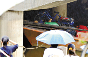 昨日上午,记者在佛山涌岸边看到,一条长约10米的船漂浮在水面上,在船头的一辆小三轮车旁边有一位约60岁的老人平躺在船头,张着嘴,曲着腿,上衣的左边挂在车脚蹬上,隐约看见他的右手里拿着一根绳子。